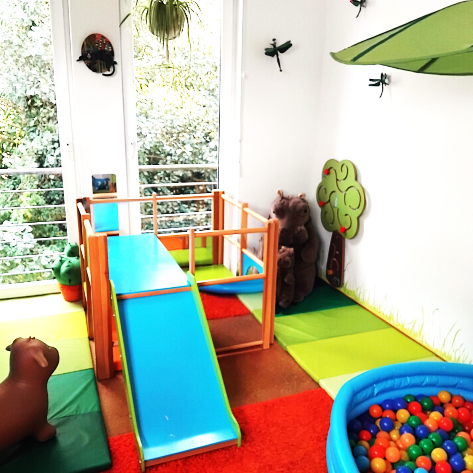 Die bodentiefen Fenster lassen den Blick nach draußen zu, wo die Natur zu entdecken ist. Die künstlerisch eingerichteten Räume und das hochwertige Spielzeug wirken inspirierend und schaffen eine persönliche Atmosphäre zum Wohlfühlen. Der Raum wird so zum dritten Erzieher.